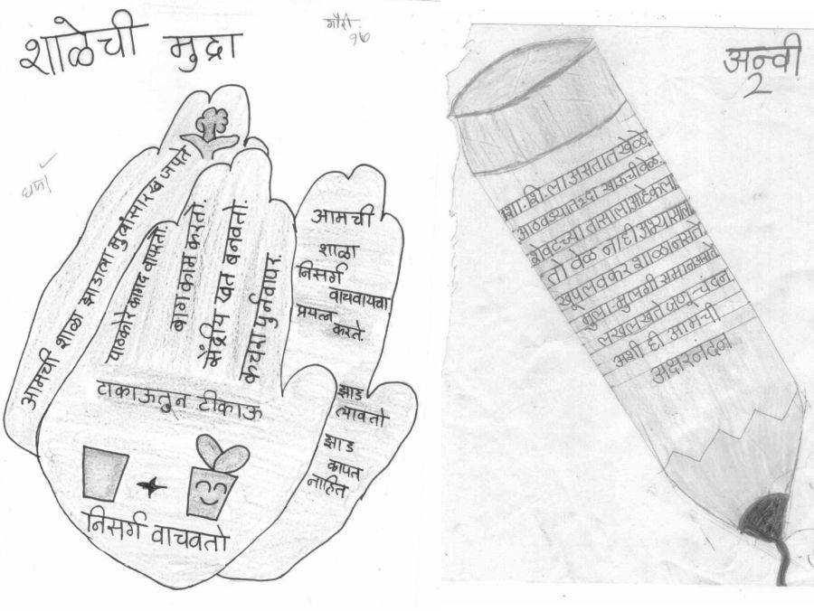 शिवरायांची मुद्रा, त्यावरील लेखन, आकार ह्या गोष्टी समजून घेतल्यावर शाळेच्या वैशिष्ट्यांबद्दल चर्चा करून, त्यातील काही वैशिष्ट्ये, आवडीचा आकार निवडून मुले शाळेची मुद्रा तयार करतात. इतिहासाचे शिक्षण असे वर्तमानाशी जोडले जाते.