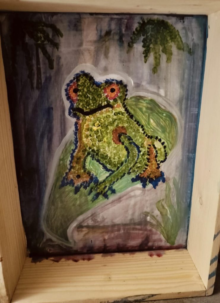 चित्र काढताना मला निरागस व्हायला व्हायचं; एकदम छोटा मुलगाच. कशाचीही भीड न बाळगता दणादण चित्रं काढत गेलो. तब्बल ५०-७५ लहान-मोठ्या खोक्यांवर आतून-बाहेरून चित्रं काढली. तेही पुरलं नाही म्हणून बाजूही रंगवल्या. त्यावर ठसेकाम करून समुद्र-कासवं चितारली. इअर बड्स वापरून बेडूक साकारताना खूप मजा यायची. गोळीबंद कापूस रंगात बुडवून त्याचे ठिपके काढताना बेडकाचं खरबरीत अंग तयार व्हायचं.