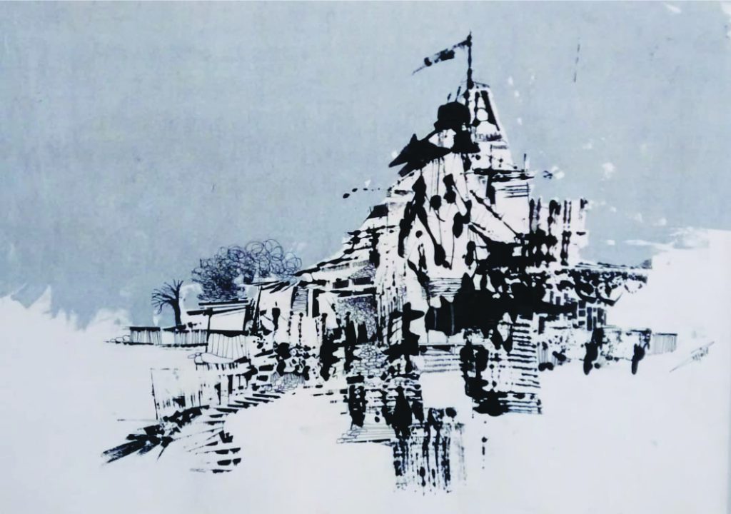 मग रमेशचा तो सर्जनशील प्रवास मला वेगळ्या प्रकारे समजला. ‘मिळून साऱ्याजणी’, ‘आंदोलन’, ‘पालकनीती’, ‘खेळघर’ अशा संघटनांबरोबर काम करताना झालेल्या अनेक चर्चा, केलेले उपक्रम, शिवाय त्यांना प्रतिमांमध्ये मांडण्याचं त्याचं काम याची वाटचालही त्याच्या या चित्रांमध्ये सहभागी होती. स्त्रियांना बळी मानण्यापेक्षा सक्षम स्त्री-पुरुष नात्याकडे जावं अशा उद्दिष्टानं केलेली ‘मिळून साऱ्याजणी’ची वाटचाल, पालक आणि मूल हे नातं मोकळं, परस्पर सन्मानावर आधारित आणि दोघांनाही वाढण्याला मदत करणारं असावं असं ‘पालकनीती’नं आग्रहानं म्हणणं, गरीब वस्तीतील असंख्य अडचणींवर मात करत मुलांना एक सक्षम व्यक्तिमत्त्व आणि संवादी सामाजिकता ‘खेळघरा’नं मिळवून देणं, असंवेदनशील व्यवस्थेनं नाडलेली माणसं जागोजागी उभी राहत सक्षमपणे आपलं अस्तित्व कशी मांडत राहतात याचा ‘आंदोलन’मधला अनुभव, हे सगळंच या चित्रांच्या दृग्गोचर होण्याच्या तळाशी आहे. काहीतरी सश्रद्ध, निरामय, सुंदर आणि शाश्वत जाणवत राहण्याचा त्याच्या मनातला आकार काय असेल तो इथे व्यक्त होताना दिसला. मुळात काळा रंग आणि त्याच्या छटा आदिम, अव्याहत, अनंत असं काही सुचवतात. इथे त्या रंगाची देवळं होतात, लेण्या होतात, भग्न इमारती होतात. कागदाच्या पोतानुसार त्यांचं प्राचीनपण, प्रवाहीपण, सुघड रचलेपण जाणवत राहतं. एक आदिम श्रद्धा, पत्र्यानं उभ्या-आडव्या रेखलेल्या रेषांना वळण देताना जाणवते. त्यांचा शोध घेताना मन आपसूक शांत होतं. उरतं ते कुतूहल.