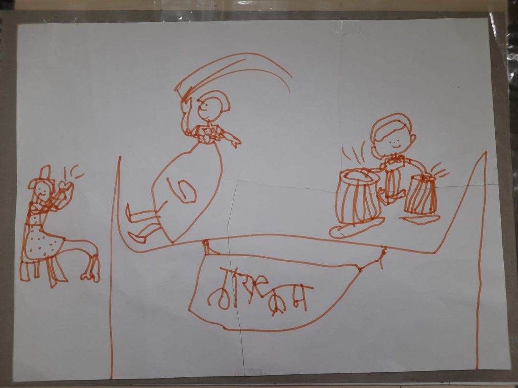तृप्तीमावशी  सतार घेऊन आली होती. ती सतार शिकते आहे. हे मोठं आणि आकर्षक वाद्य बघून मुलं हरखून गेली होती. तिनं सगळ्यांना वाद्याची ओळख करून दिली. थोडे अलंकार आणि भूप राग वाजवून दाखवला. त्यावर आधारित ‘देखा एक ख्वाब’ गाणं वाजवलं . ‘चॉकलेटचा बंगला…’ आम्ही सतार आणि पेटीवर एकत्र वाजवायला सुरुवात केल्यावर मुलांनी गाणं म्हणत नाचायला सुरुवात केली. सगळं काही ‘लाईव्ह’ असण्यातली ही मजा न्यारी होती. तन्वीमावशीनं म्हटलेल्या गाण्यावरही मुलं नाचली. छोट्या विहाननं तन्वीमावशीबरोबर एक कविता म्हटली. कार्यक्रम खूप भरगच्च आणि अगदी आखीव नको, त्यात मुक्तता हवी, मुलांचा सहभाग हवा असा विचार होताच, त्यामुळे आणखीही काहीबाही सुचलं होतं ते जाणीवपूर्वक केलं नाही.