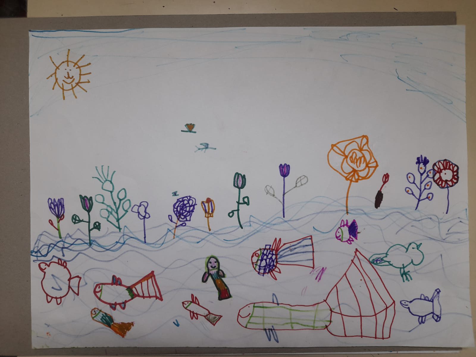 “… ही मोठ्ठी नदी. हा मासा अगदी वर पोहतोय. तो राजा आहे आणि हा मासा या माशाचा नवरीमासा. हा छोटा बाळमासा. हे कासव, ही पाणकोंबडी, वर सगळी पाण्यातली झाडं, कमळ, फुलं,  आकाश, सूर्य…”